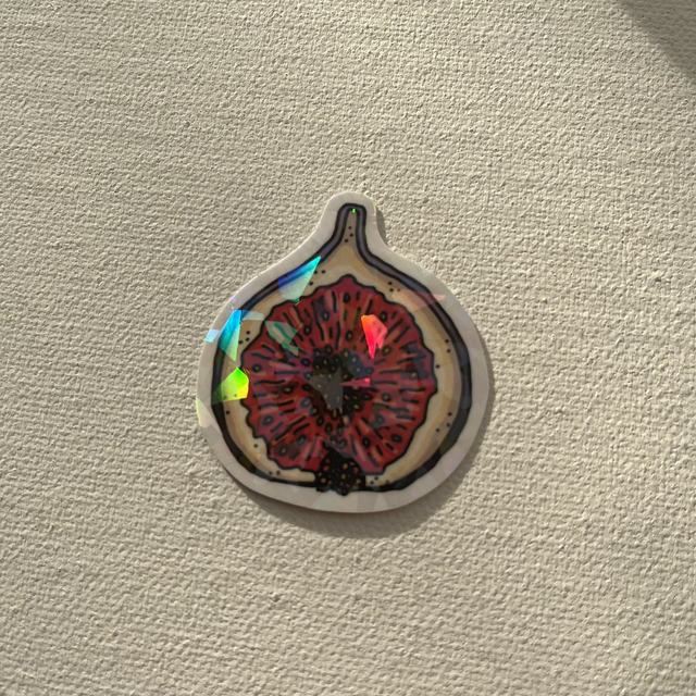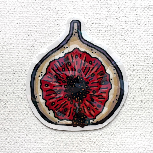 Alle Motive sind von Hand gezeichnete digitale Illustrationen die ich drucke, laminiere und von Hand ausschneide. Dadurch können leichte Randabweichungen auftreten, was jeden Aufkleber zu einem Unikat macht. Der Sticker zeigt eine illustrierte aufgeschnittene Feige und ist Vinylfolie in "broken glass" Optik überzogen. mit Ideal, als Geschenk, um Laptops, Notizbücher, oder sonstige Gegenstände individuell zu gestalten!