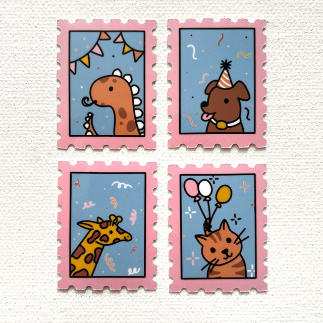Dieses Stickerset besteht aus 4 handgemachten Stickern in Briefmarkenoptik mit Tieren in Feierlaune. Einer Giraffe, einer Katze mit Ballons, einem Hund mit Partyhut und einem Dino. Alle Stickermotive sind von Hand gezeichnete Illustrationen die ich drucke, laminiere und mit meinem Plotter ausschneide. Ideal als Geschenk zum Geburtstag oder anderen Feierlichkeiten, um das leere Briefmarkenfeld auf Geburtstagskarten mit einem Sticker zu füllen oder Laptops, Notizbücher, oder andere Gegenstände zu gestalten!